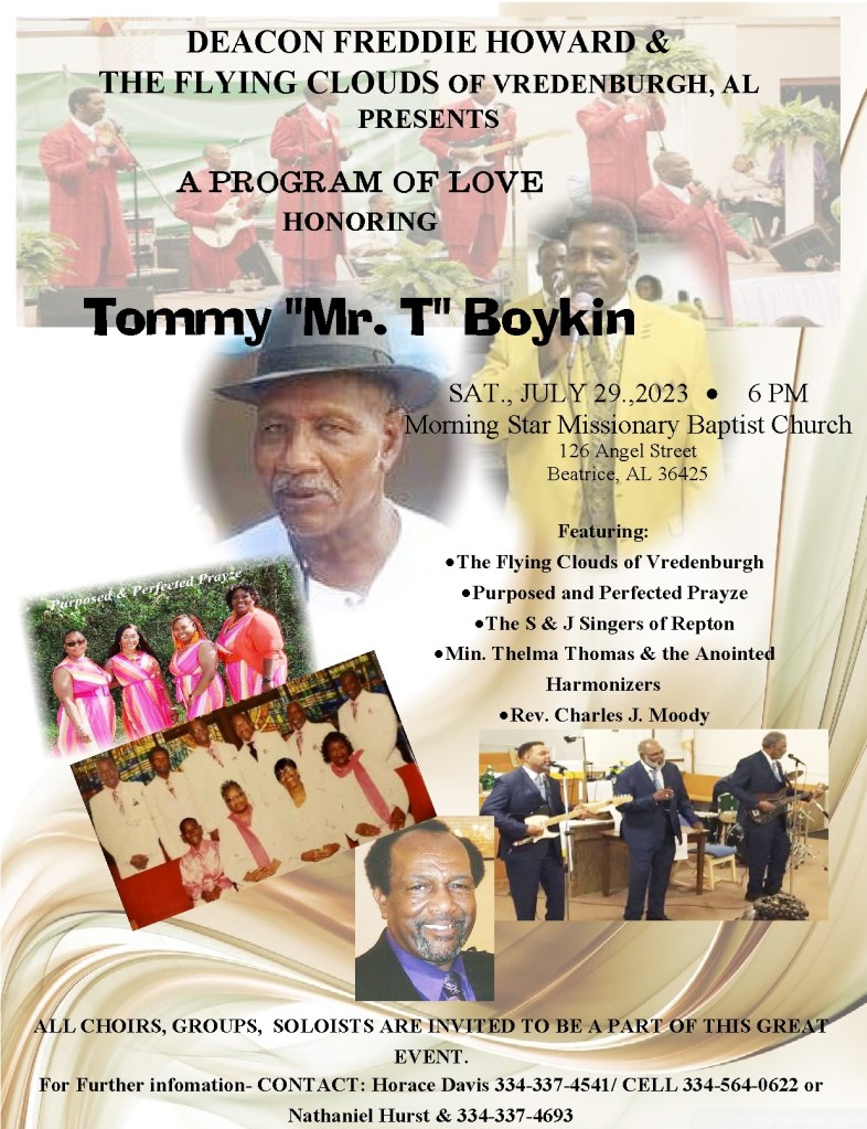 ALL CHOIRS, GROUPS.,SOLOIST,,INVITE Please Contact The Flying Clouds of Vredenburgh Alabama Booking 334-564-0622